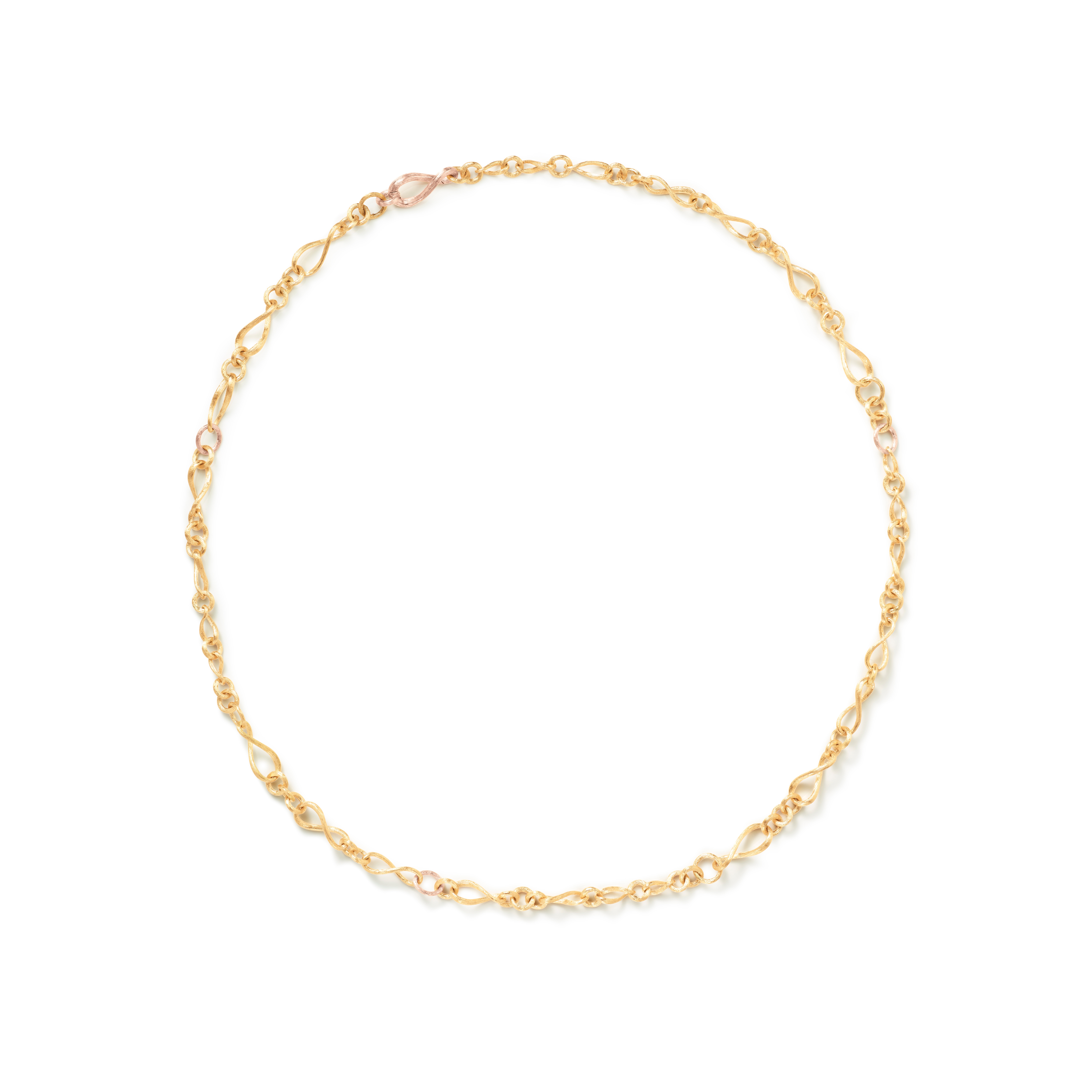 Love collier mini fra Ole Lynggaard Copenhagen i 18 karat gult gull og i 18 karat rosègull. Overflaten er satinert / matt. Lengde 45 cm.